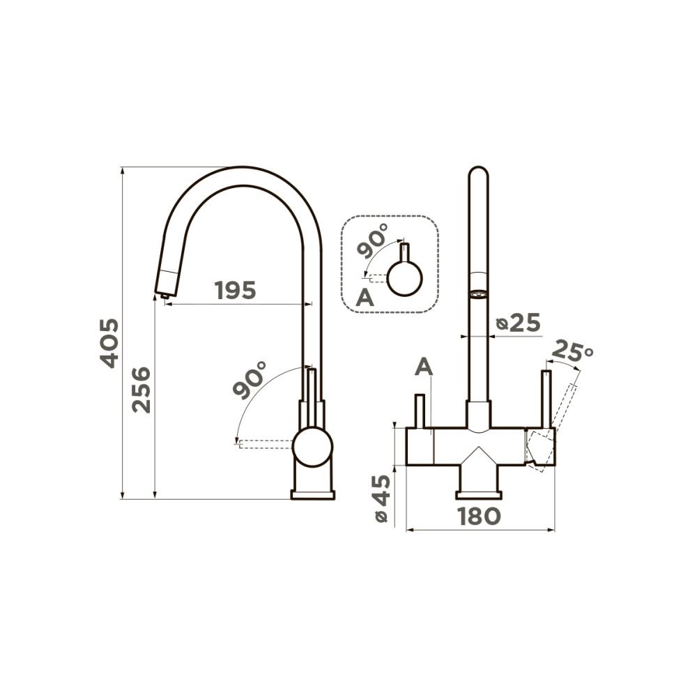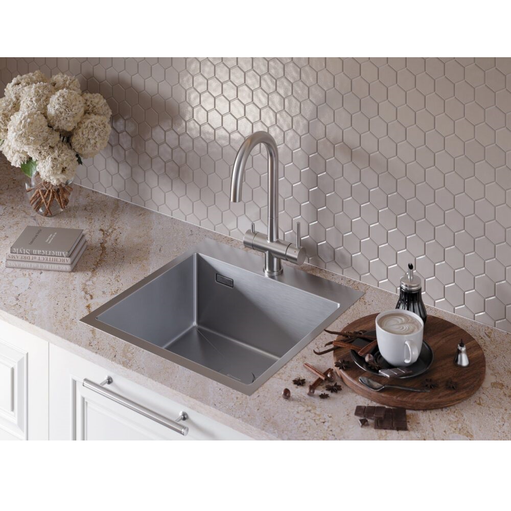 Смеситель для кухни Omoikiri Akita с подключением фильтра оснащен рычажным управлением для регулировки температуры и напора воды. Горизонтальный монтаж на 1 отверстие. Поворотный излив 195 мм.