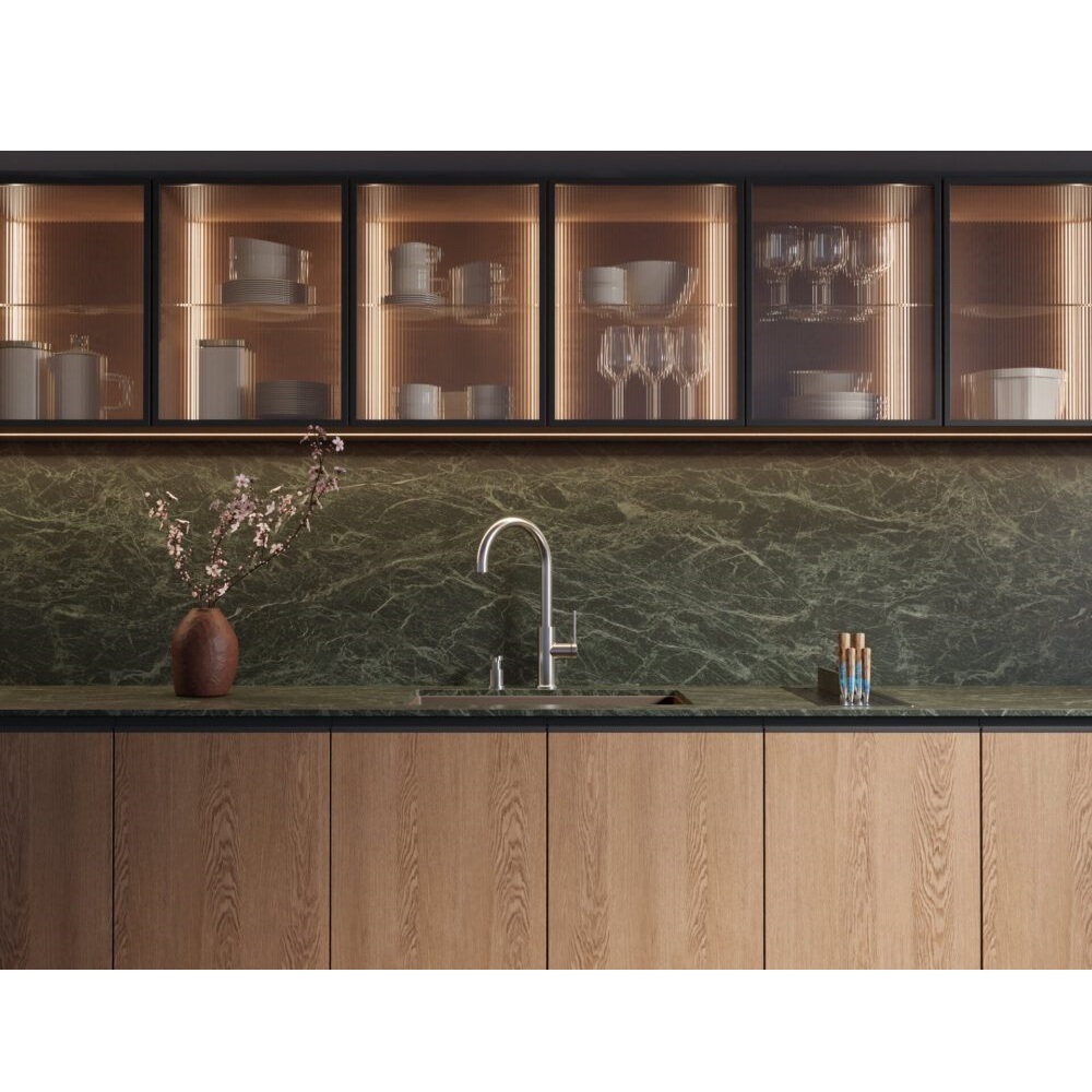 Смеситель для кухни Omoikiri Okawa 2 Plus с подключением фильтра оснащен рычажным управлением для регулировки температуры и напора воды. Горизонтальный монтаж на 1 отверстие. Поворотный излив 215 мм.